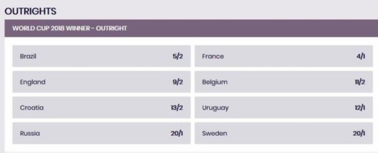 随着英格兰点球大战以总比分5-4淘汰哥伦比亚。世界杯8强已经全部产生,著名博彩公司dabblebet也更新了最新的夺冠赔率,巴西以2赔5排名第一,法国1赔4排名第二,英格兰飙升至第三位,赔率为2赔9。