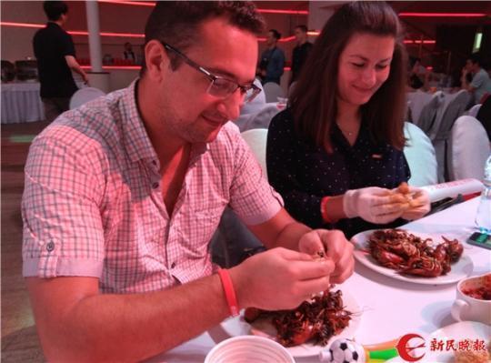 图说:俄罗斯食客正在品尝小龙虾 新民晚报特派记者 关尹 摄