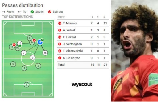 从Wyscout的技术统计可以看到,费莱尼直接顶到一个前腰的位置。这样的做法,其实目的是要增加阵地战时,球队在禁区内的兵力。可以看到的是,费莱尼一共接应到了10次队友的传球,其中7次来自于右翼卫穆尼耶,2次来自于阿扎尔,目的就是他能完成头球攻门。