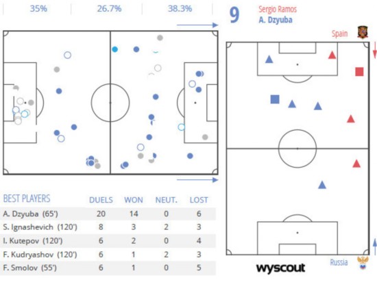 从Wyscout的技术统计可以看到,本场比赛中,俄罗斯一共尝试了61次的高空球争夺,其中将近3分之一,也就是20次的高球争夺来自于久巴。他赢下了其中的14次,有着高达7成的成功率。从右图上我们可以看到,久巴在与拉莫斯的一对一对抗中,赢下了靠近中路的5次。只有在去到边路位置,拉莫斯方才赢下4次。他在中路的战术价值之大,是俄罗斯可以扛住比赛前半段的关键原因。