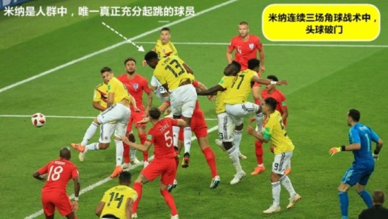 从高清图可以看到,米纳是角球进攻中,唯一充分起跳的球员