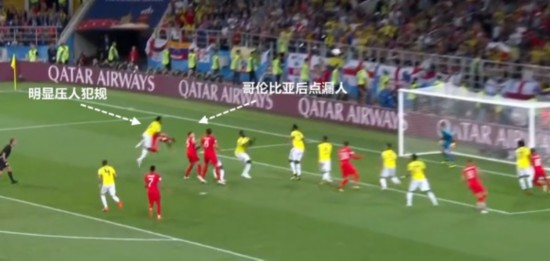 从高清图上可以看到,当时哥伦比亚6名球员成直线在中路位置,真正起跳的,是身高最高的米纳。这种战术的目的,就是要限制防守人起跳,最终利用高点破局。