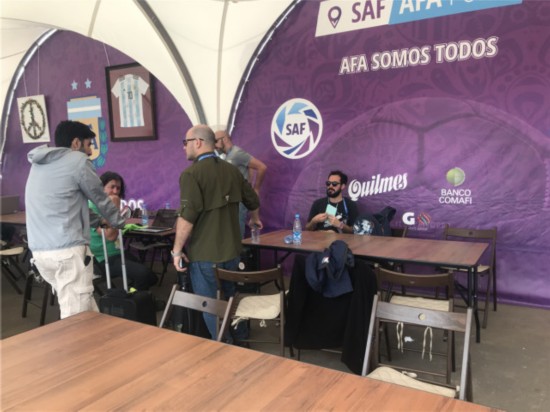 法国的博物馆驻地 而法国驻地正像法国人本身极简,虽然选址很高达上,但是媒体服务餐却比较简单。除了咖啡和果汁是免费的,所有的简餐食物都是要在博物馆购买,价格也并不便宜啊! 阿根廷驻地:帐篷新闻中心很有南美特色 阿根廷历来都把驻地放在非常偏远的地方,这次也不例外。虽然都是在莫斯科郊区,虽然跟法国一样都是距离市区70多公里,但是因为高速公路常年堵车,开车过去至少要两个小时才能到达。