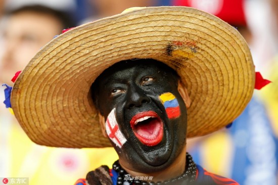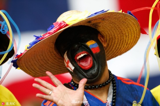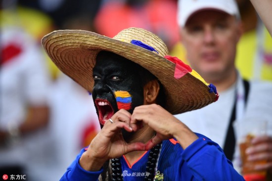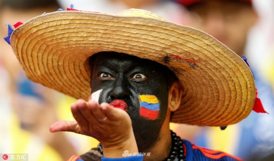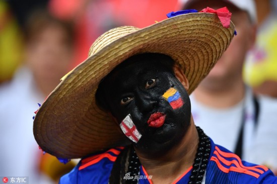 当地时间2018年7月3日,俄罗斯莫斯科,2018世界杯1/8决赛,哥伦比亚VS英格兰。哥伦比亚“大黑脸”球迷嘟嘴送飞吻