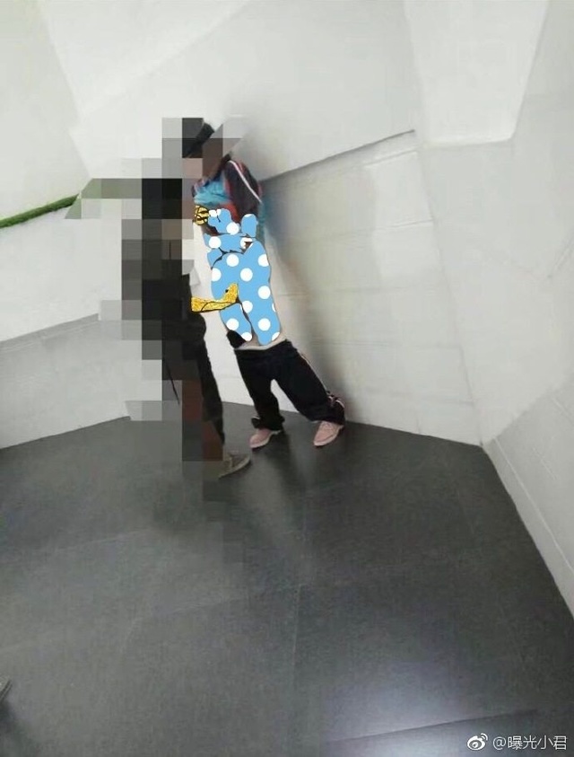 照片中,疑似一男一女两名学生在楼梯上做出不雅动作,现场还有第三人。