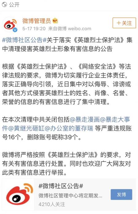 “暴走漫画”在自媒体平台发布了一段时长58秒、含有戏谑侮辱董存瑞烈士和叶挺烈士内容的短视频。