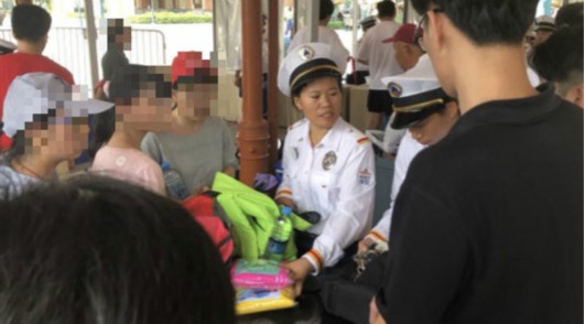 因随身携带了一大袋包括寿司、面包等食物,一家四口只能站在安检边上,狼吞虎咽吃掉尽可能多的食物。父亲一边吃一边叹息说,第一次来乐园,并不知道禁带食物的规定。刚在地铁口买的食物就这么扔掉,太浪费了。