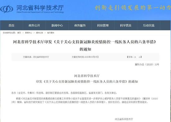 根据《河北省应对新型冠状病毒感染肺炎疫情工作领导小组关于全面落实进一步保护关心爱护医务人员若干政策意见的通知》(冀政传〔2020〕2号)精神,为解除一线医务人员开展科研工作后顾之忧,支持一线医务人员全身心投入打赢疫情防控阻击战,河北省科技厅研究制定了《关于关心支持新冠肺炎疫情防控一线医务人员的六条举措》。 一、优先支持科研项目立项。省级科技计划基础研究专项、生物医药专项和民生科技专项卫生健康领域申报的项目,同等条件下,优先支持由一线医务人员作为项目负责人且以所在单位名义申报的项目。 二、进一步放宽科研项目执行和验收期限。在前期省级科技计划项目执行期、待验收项目验收期统一延长3个月的基础上,对一线医务人员作为项目负责人的项目,经所在单位提出申请后可再延长3个月。 三、延长自然科学基金项目申报收录检索证明认定时效。一线医务人员申报基础研究计划自然科学基金专项的,对于2015年以后开具符合要求的收录检索证明均认定有效。 四、优先入选创新创业人才团队。同等条件下,优先推荐一线医务人员参加国家有关人才计划评选,优先支持入选省科技型中小企业创新英才和产业创新团队。 五、优先支持开展国际创新人才交流合作。同等条件下,优先支持一线医务人员参加科技卓越人才国际交流计划、申报外专引才引智专项,重点支持一批一线医务人员赴国(境)外进行专业技术培训和国际交流,资助其在国(境)外活动费用。 六、优先支持申报科技奖励。一线医务人员不受科技奖励提名间隔年限限制;对在疫情防控前线工作或对疫情防控作出重大贡献的科技人员,符合条件的优先提名河北省突出贡献奖;对参与我省疫情防控贡献突出的外国专家、省外专家,优先提名河北省科技合作奖。