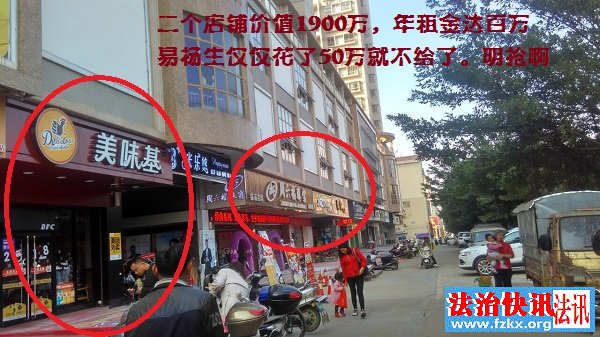 易杨生看中项目大门口左右二个门面,在刘芳平协调下,原购买者李瑞文只好原价673.496万元转让,易杨生仅仅交了50万元给李瑞文。2015年1月20日,李瑞文通过EMS给易杨生《债权转让通知书》,称将余款623.496万元商铺尾款转让给刘芳平。但易杨生不还给李瑞文,也不按照李瑞文的声明抵扣刘芳平欠款,就花50万元就霸占了这价值1900多万元的商铺,如今为“美味基”和周六福珠宝等,年租金高达100多万元。