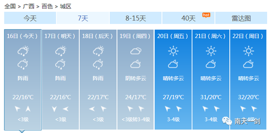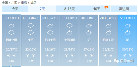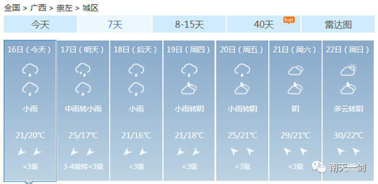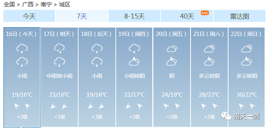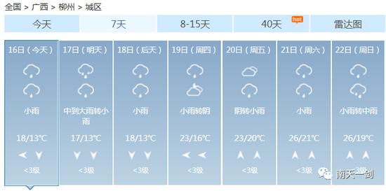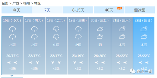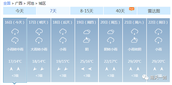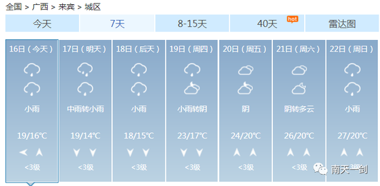 这个周末 各位过得还好吗? 是继续宅在家用心钻研厨艺 还是在床上躺平平度过愉快的两天 ![]() 不知道有没有人跟小编一样 在这样的天气里陷入了纠结 穿短袖又有点凉飕飕 穿毛衣又热得一身汗 ![]() 升温、降温、强降雨、雷暴大风…… 未来几天广西的天气关键词有点多 信息量有点大 ![]() 3月的天气像极了你的女朋友 忽冷忽热 令人捉摸不透 ![]() 这个时候四季交错无常 广西的天气阴晴变化更是出乎你想像 让人把不准天气的脉搏 家里四季的衣服堆了一堆 全都无法收进衣柜 ![]() 没办法,春天的天就是说翻脸就翻脸 不按常理出牌 ![]() 上一轮冷空气走后暖湿气流迅速占领了八桂地盘其技能之一就是升温让天气变暖预计明后两天暖湿气流加强各地气温继续保持回升的姿势尤其桂西北及桂南大部最高气温将升至22~25℃北海最高升至27℃ ![]() 如果说只有暖湿气流掌控全场那么广西的天气也不会变得那么动荡不安偏偏舞台上曾经最风光的冷空气不甘星光从此变得暗淡它一次又一次地反攻用一次又一次的降温、降雨来争夺天气主角 一股新的冷空气即将袭来16日晚-17日它先入侵桂北18日继续南下17-18日冷空气将给各地带来3~6℃的降温不仅如此预计16日晚起它还将给桂北、桂中带来强降雨局部甚至会出现暴雨到大暴雨同时伴有短时雷雨大风等强对流天气 未来几天内 广西将经历升温、降温、强降雨、雷暴大风等天气 冷空气打破了平静 广西的天气变得热闹起来 大家要注意穿脱衣服的速度 要跟上天气变化的节奏 具体预报 陆地天气预报 今天白天,全区阴天大部有小雨,其中防城港、钦州等市局部有大雨。 ![]() 森林火险气象等级:桂东3级,较高火险;其它地区2级,较低火险。南宁市:15日晚上到16日白天,阴天有小雨,东南风1~2级,最低气温17℃,最高气温20℃。17-18日,桂北、桂中部分地区有大雨,局部暴雨到大暴雨或短时雷雨大风等强对流天气,我区其它地区阴天有小雨。受冷空气影响,各地气温下降3~6℃。 ![]() 3月的冷空气还是会频繁南下的 乍暖还寒的季节 厚衣服别脱太快 薄衣服也别穿太早 毕竟,现阶段的我们可不敢生病啊~ ![]() 南宁 ![]() 柳州 ![]() 桂林 ![]() 梧州 ![]() 北海 ![]() 防城港 ![]() 钦州 ![]() 贵港 ![]() 玉林 ![]() 百色 ![]() 贺州 ![]() 河池 ![]() 来宾 ![]() 崇左 ![]() 仿佛听到有小伙伴表示这降温“弱弱哒” ![]() 听小编一句劝: 不能单看温度变化的哈 本次冷空气是降温配合降水,体感会更显清凉 穿暖点一定错不了,切不可让感冒趁虚而入! ![]() 来源:广西天气、中国天气网 |