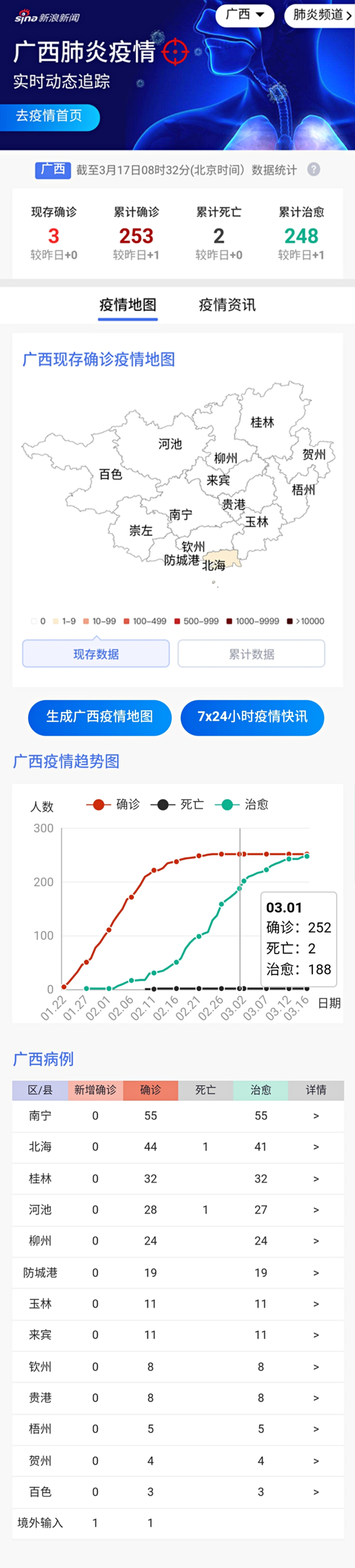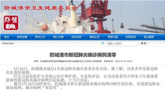 来源:自治区卫生健康委员会 ![]() 3月16日0-24时,我区无新增本地确诊病例;无新增本地疑似病例;无新增死亡病例。 ![]() 目前全区累计报告本地确诊病例252例,累计出院248例,累计死亡2例。现有在治本地确诊病例2例,其中危重病例1例。全区现无本地疑似病例。 新增境外输入确诊病例1例,为意大利返回的广西籍学生,进入广西后立即被集中隔离,现在定点医院治疗。现有输入性密切接触者27人正在接受集中隔离医学观察。 ![]() 来源:防城港市新型冠状病毒感染的肺炎疫情防控工作领导小组指挥部 ![]() 3月16日,防城港市最后1名新冠肺炎确诊患者治愈出院。据了解,该患者曾是新冠肺炎危重症病例。 经定点医院医护人员精心治疗和护理,专家组评估,认为该患者符合国家卫生健康委最新的新冠肺炎确诊病例出院标准,于当日出院。 截至3月16日18时50分,防城港市累计新冠肺炎确诊病例19例全部治愈。实现新冠肺炎疑似病例、确诊病例“双清零”。 |