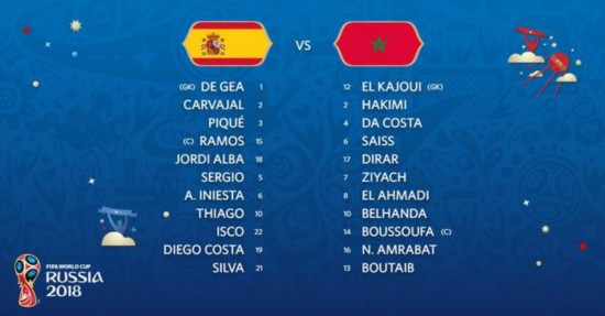 西班牙(4-2-3-1):1-德赫亚;2-卡瓦哈尔,3-皮克,15-拉莫斯,18-阿尔巴;5-布斯克茨,10-蒂亚戈;21-席尔瓦,6-伊涅斯塔,22-伊斯科;19-迭戈-科斯塔
