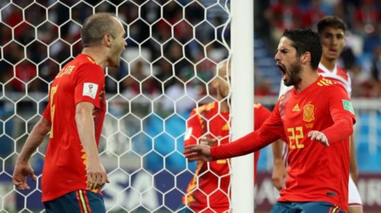 北京时间6月26日02:00(加里宁格勒当地时间25日21:00),2018年世界杯B组末轮一场比赛在加里宁格勒球场展开角逐,西班牙2比2险平摩洛哥,布塔伊布先拔头筹,伊斯科扳平,西班牙门框救险,替补出场的恩内斯里第81分钟进球,同样替补出场的阿斯帕斯第91分钟再次扳平。西班牙因进球多优势力压葡萄牙获得小组头名,1/8决赛将战俄罗斯。