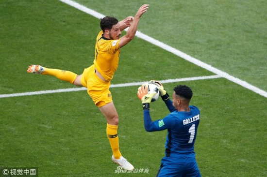 2018年6月26日,俄罗斯索契,2018俄罗斯世界杯小组赛C组,澳大利亚0-2秘鲁。 Australia\'s forward Mathew Leckie (L) jumps for the ball next to Peru\'s goalkeeper Pedro Gallese during the Russia 2018 World Cup Group C football match between Australia and Peru at the Fisht Stadium in Sochi on June 26, 2018. RESTRICTED TO EDITORIAL USE - NO MOBILE PUSH ALERTS/DOWNLOADS Odd ANDERSEN / RESTRICTED TO EDITORIAL USE - NO MOBILE PUSH ALERTS/DOWNLOADS