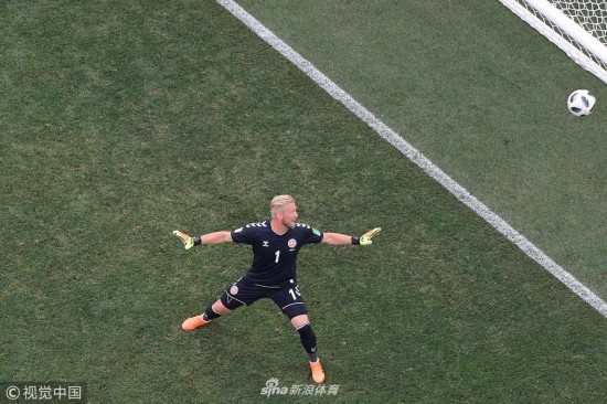2018年6月26日,俄罗斯莫斯科,2018俄罗斯世界杯小组赛C组,丹麦Vs法国。 卡斯帕·舒梅切尔防守 Denmark\'s goalkeeper Kasper Schmeichel reacts to a shot during the Russia 2018 World Cup Group C football match between Denmark and France at the Luzhniki Stadium in Moscow on June 26, 2018. RESTRICTED TO EDITORIAL USE - NO MOBILE PUSH ALERTS/DOWNLOADS Francois Xavier MARIT / RESTRICTED TO EDITORIAL USE - NO MOBILE PUSH ALERTS/DOWNLOADS