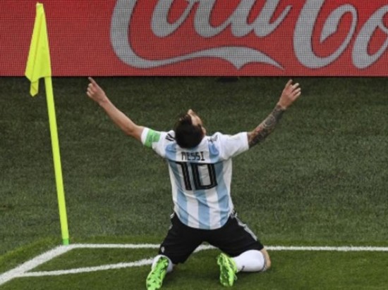 进球后的梅西滑跪在地,双手指天激情庆祝