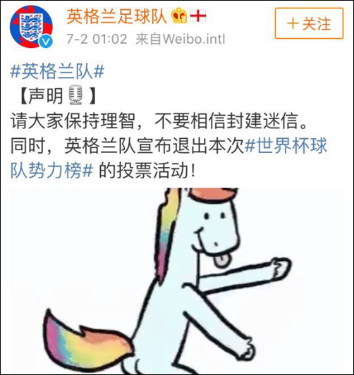 于是,英格兰球迷开始疯狂给哥伦比亚队刷票,@英格兰队球迷俱乐部 出动,号召广大球迷一起上。