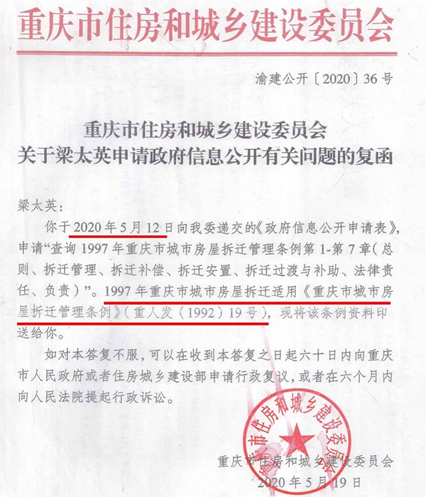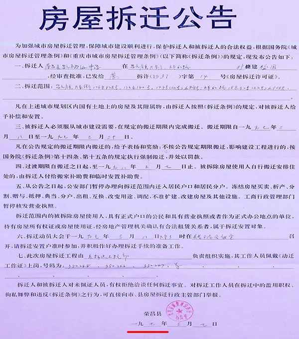 “房管局副局长说,今年的拆迁政策是,各了各的算,口头传达的,没有拆迁文件?” 1997年,荣昌县昌元初级中学扩建校园,需拆迁昌元镇大东街106-128号、132号-140号、144号(双号)及附号、祥和路18至32号(双号)及附号等约六千平方米建(构)筑物。 3月8日,在县老干局会议室召开拆迁安置动员大会,房管局副局长张远淑(下称张局长)主持会议,说今年的拆迁政策是,各了个各的算。房管局按评估价把你的房子买过来,修好后你又按评估价买回去。 梁太英说:“我和我老公多次要求看拆迁文件,张局长说是口头传达的,没有拆迁文件。” “我是在2020年5月12日通过政府信息公开方式,才获取由重庆市住房和城乡建设委员会提供的1997年重庆市城市房屋拆迁适用的是《重庆市城市房屋拆迁管理条例》(重人发〔1992〕19号),又在2022年1月5日获取由重庆市荣昌区房屋征地拆迁中心(下称征地拆迁中心)获取的《荣昌府发〔1995〕60号关于旧城改造中商业用房的认定及安置的通知》早在1995年3月24日出台。” (重人发〔1992〕19号)。梁太英 供图 荣昌府发〔1995〕60号。梁太英 供图 “虽然在2022年调取的房屋拆迁公告显示有拆迁条例,其真实性存在问题。日期也是‘197年’3月7日,为三国时期。” 2022年调取的房屋拆迁公告。梁太英 供图 “在2007年调取的《拆迁安置补偿协议书》里,仍然没有公开当年拆迁安置补偿政策文件依据。”