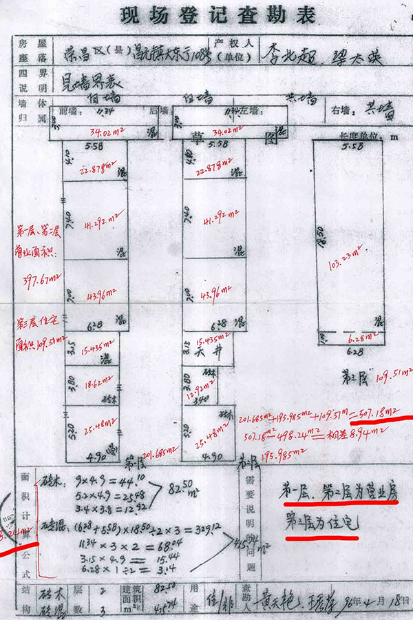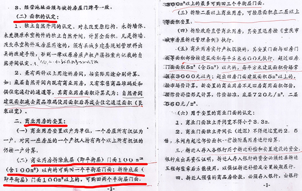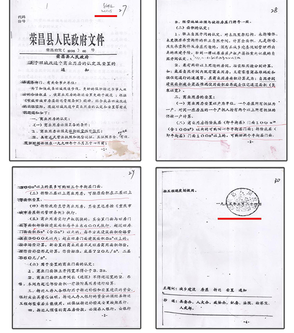认定拆迁有效面积507.83㎡ ,实际安置409.33㎡(其中住房393.1㎡、门面16.23㎡),何时补差98.5㎡? “拆迁工程部根据《现场查勘表》计算面积为498.24㎡,我算出来的结果又是507.18㎡,最终认定有效面积为507.83㎡。”梁太英说,荣昌区住建委信访回复拆迁范围内房屋产权证证载面积只有498.24㎡的数据与事实不相符。原县房管局根据荣昌府〔1995〕60号、〔1996〕96号文件及该片区补偿安置方案相关规定认定拆迁有效面积507.83㎡(住宅259.83㎡、营业16.23㎡、非住宅231.77㎡),双方计算出来的结果仅相差0.65㎡,并未按照文件补偿。 《现场查勘表》显示,拆迁范围:第一层201.685㎡、第二层195.985㎡、第三层109.51㎡;第一层第二层为营业房合计397.67㎡,第三层为住宅,只有109,51㎡。 因此,荣昌区住建委信访回复住宅面积、营业面积、非住宅面积与《现场查勘表》记载数据差异极大。 按照《荣昌府发〔1995〕60号》之规定:“商业用房拆除底层(即平街层)门面100㎡(含100㎡)以内的可购回一个平街层门面;拆除底层(即平街层)门面100㎡(含100㎡)以上的可购回两个平街层门面。”梁太英说:“我家底层营业面积201.685㎡,应该安置两个门面,然而才安置16.23㎡。” 荣昌府发〔1995〕60号文件。梁太英 供图 《荣昌府发〔1995〕60号》还规定:“商业用房实行产权调换的,其安置门面与旧房门面等面积部份按建筑面积每平方米600元执行,超过旧房门面面积5㎡(含5㎡)以内的,每平方米建筑面积价格掌握在3000元以内;超出旧房门面建筑面积5㎡以上的,按市场价计算,新安置的商业用房不足旧房商业用房面积部份,按作价补偿形式计算,作价标准,底层720元/㎡,二层560元/㎡。”梁太英说:“安置营业面积16.23㎡,超面积10㎡,合计26.23㎡。其中,超面积5㎡×1170元/㎡,5㎡×3500元/㎡,荣昌区住建委信访回复说我买的10㎡是安置面积,与事实不符。” “底层营业面积201.685㎡,根据《荣昌府发〔1995〕60号》规定,应该安置两个门面,每平方米只补600元。然而,房管局张局长隐瞒政策,说我如果要选两百多平方米的门面,超出一平方米要补3800元,一共要补八十几万,叫我选住房。” 梁太英说:“认定有效面积507.83㎡-已安置四套住房和一个门面面积合计409.33㎡=何时补差98.5㎡?营业用房充住房安置也应按文件补差。”