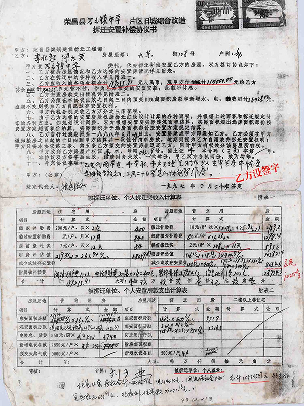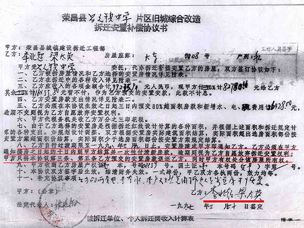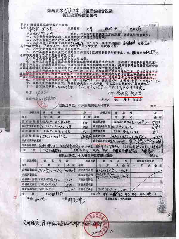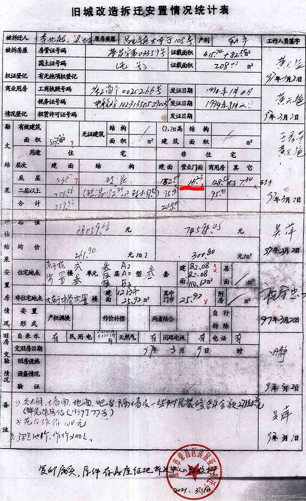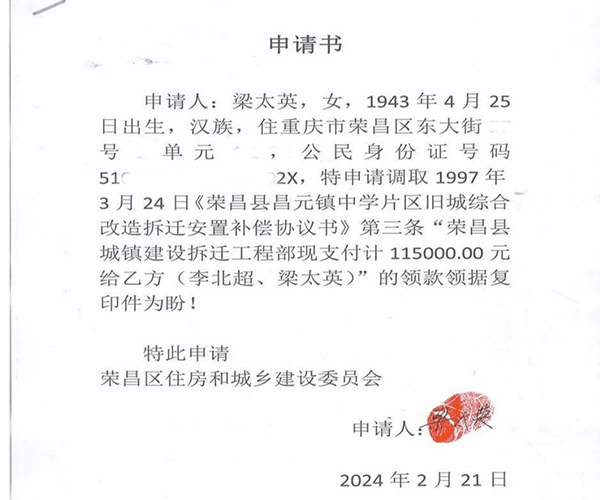 “住宅面积109.51㎡改为259.83㎡,非住宅由397.67㎡改为248㎡(商业用房223.52㎡、其它7.34㎡、营业用房只有16.23㎡)” 房管局下属部门荣昌县城镇建设拆迁工程部(下称拆迁工程部)在拆迁动员大会之前的1996年4月18日已对昌元镇大东街108号李北超、梁太英私有财产进行了现场登记查勘(下称现场查勘表)。 现场登记查勘表。梁太英 供图 梁太英说:“房屋一共三层,从2021年12月14日调取的《现场查勘表》数据计算,第一层201.685㎡,第二层195.85㎡,第三层109.51㎡,合计507.18㎡。查勘表注明,第一层、第二层为营业用房,共397.67㎡,第三层为住宅只有109.51㎡。” 查勘人黄天艳、王秀荣计算,三层合计才498.24㎡,比梁太英计算的507.18㎡少8.94㎡。最终认定有效面积为507.83㎡。 从2021年3月10日调取的1996年3月20日《旧城改造拆迁安置情况统计表》(下称拆迁安置统计表)来看,住宅面积由《现场查勘表》109.51㎡改为259.83㎡,非住宅面积由397.67㎡改为248㎡(商用房223.52㎡、其它7.34㎡、营业用房只有16.23㎡)。 旧城改造拆迁安置情况统计表。梁太英 供图 梁太英说:“一楼进门门面是摄影器材→歌舞厅→包间→舞厅厨房,53.27㎡住宅面积从何而来?二楼前面是休息室→摄影场→餐厅→天井→餐厅备料间→餐厅厨房,哪来的259.83㎡住宅面积?三楼才是住宅,四个寝室,一共只有109.51㎡。” “第一份协议消失,第二份协议显示被安置户“签名”却申明作废,第三份协议有效又没有被安置户签名?” 梁太英说,她家拆迁面积最多,安置面积最少,1997年拆迁,1998年搬进安置房后,因安置补偿不合理,一直没有去办理房屋产权证。是2006年3月房管局的人说,‘再不去交安置房款和办理房产证,就视为自愿放弃拆迁安置权利’。这一条款也写入了《拆迁安置补偿协议书》。 “3月14日,我才到房管局把《拆迁安置情况统计表》、《拆迁安置补偿协议书》(没有签名)拿回来,第二天才到大厅产权证登记窗口交钱,交钱后工作人员将统计表和协议收回,一个星期后,带上交款收据去领取产权证的。” 梁太英说:“交钱时那份协议,是第一份协议,下方注明有补门面 款38000元、住房款50928.86元,这份协议之后消失了,只有一份收据,总金额为88928.86元,” 门面、住房交款收据。梁太英 供图 “那份协议,我也看见,补门面款38000块钱,住房补多少钱记不起了。”梁太英的女儿说。 “2007年,我到拆迁中心把《拆迁安置补偿协议书》调出来看,不是第一份办产权证那份协议,下面没有注明门面、住房补多少钱了,也没有显示我和我老公(已故)‘签名’。该协议为第二份,显示日期1997年3月24日。” 第二份协议,没有被安置户签字、盖印。梁太英 供图 之后,每次调出来的都是1997年3月24日那份协议。 梁太英说:“2021年3月10日,拆迁中心田静科长说找到我们当年签名的安置补偿协议了,该份协议为第三份,显示1997年3月20日签订,又被3月24日那份协议注明作废,显示乙方李北超、梁太英姓名却不是本人签名。” 第三份协议,乙方不是本人签名。梁太英 供图 “11.5万元领款领据变成11.0663万元交款收据,财务科档案室拒绝直接复印和发照片凭证给被安置户” 1997年3月24日《拆迁安置补偿协议书》显示,乙方李北超、梁太英(下称梁太英)在拆迁中各种收入金额合计199235.91元,安置房款总计支出159735.07元,现甲方(下称拆迁工程部)支付115000元给梁太英,其余计84235.91元暂不支付,作为梁太英预交的安置房款。梁太英必须在本协议生效之日起十日内预交80%超面积房款和新增水、电费用计26428元,逾期不交则视为自愿放弃安置权利。 隐瞒文件,逾期不交款则视为自愿放弃安置权利。梁太英 供图 2024年2月21日下午,梁太英到重庆市荣昌区自然规划局档案室调取拆迁工程部支付115000元给她的领款领据,工作人员说没有,叫去拆迁中心调取。拆迁科长田静说,115000元的领款领据肯定是有的,保存在兴荣大厦财务中心,要求把领款领据申请书留下,他们调出来后通知。 调取115000领款领据申请书。梁太英 供图 梁太英来到兴荣大厦五楼财务中心,几名工作人员都说,这些领款领据2019年全部交到住房和城乡建设委员会(下称荣昌区住建委)了。 2月22日上午,梁太英来到荣昌区住建委财务科递交申请,下午两点钟又来财务科,该工作人员指着摆放在桌子上的票据说:“交给我们只有这几本,从上午找到现在,没有找到。一会田科长过来开会,叫他去中天公司查。” 下班前,敖科长在电话中说,翻遍了,查不到了,已正式告诉田科长,叫他去中天公司查一下。 “你不是说中天公司是个体吗?这些票据怎么会保存在中天公司?”敖科长说,之前的事情不太清楚。 2月23日,田科长说:“我们还在查,那边没得,我们派人过去查,他们可能不清楚。我们派人在几个地方查,还要在中天公司查。” “中天公司属于什么性质?这些票据怎么由他们来保管?”田科长说:“是股份公司,原来的拆迁代办机构。” “中天公司又有房管局的人和还有他们的家属是怎么回事?”田科长说:“那个我,我也不清楚。” 梁太英说:“1997年拆迁时,田科长已是负责旧房设施设备情况验证,难道不清楚?” 通过启信宝查询,中天房地产有限公司成立于1999年12月9日,梁太英大东街108号房屋拆迁于1997年3月,怎么将领款领据保存在两年后才成立的拆迁代办公司?该票据1997年3月至1999年3月两年期间又存在哪里? 2月26日,田科长递给梁太英的不是115000