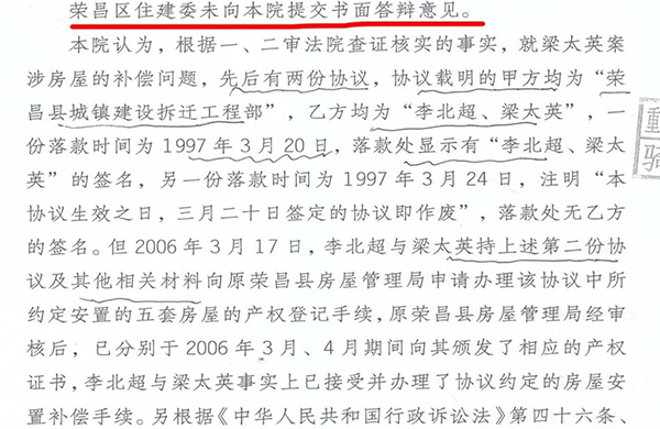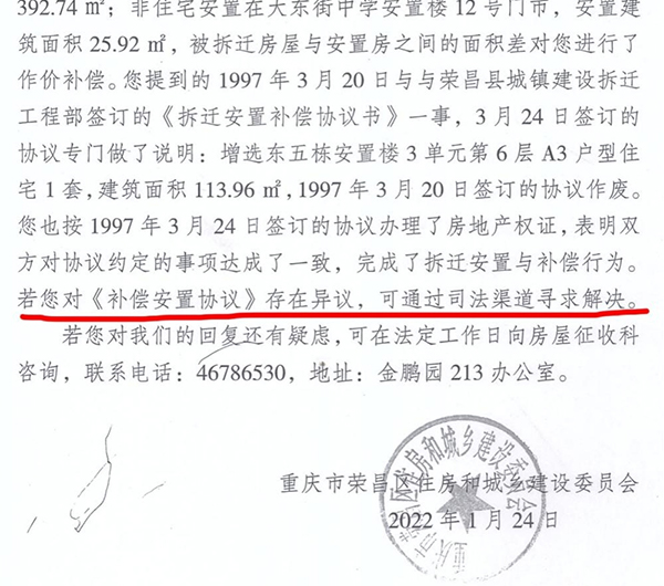 “区住建委:被拆迁房屋与安置房之间的面积差已进行作价补偿,若对补偿安 置存在意义,可通过司法渠道寻求解决” 荣昌区住建委在信访回复中提到:“根据你户于1997年3月24日与拆迁人‘荣昌县拆迁工程部’达成了补偿安置协议内容,你户与安置房之间的面积差,以‘减少或放弃安置费’进行了作价补偿。故我委认为你户的拆迁补偿不存在隐瞒、霸占你户的合法财产。我委认为拆迁当事人双方已经达成补偿协议,表明双方对协议事项的约定成立,完成了拆迁安置与补偿行为。” 梁太英说:“1997年3月24日那份《拆迁安置补偿协议书》2007年才调取到,是有一项减少或放弃安置费,该协议没有我们签字、盖章,当时是因为房管局工作人员说,如果还不去结算并付清款,逾期则视为我自愿放弃拆迁安置权利,并退回预交的安置房款,他们还有权处分房屋所有权,在万般无奈的情况下,我才在2006年交了88928.86元,把房产证领了。” 信访回复还提到,梁太英若对《拆迁补偿安置协议》存在异议,可通过司法渠道寻求解决。